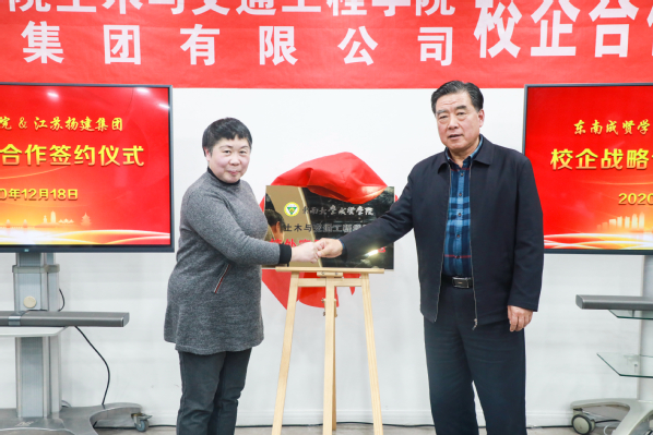 扬建集团总裁梁云彪首先对来访的我校各位领导、老师表示欢迎,希望加强与我校土木与交通工程学院的校企合作,扩展实习、实训场所,在实训中不断提升工程实践能力,提升专业素养。扬建集团总经理邹厚存就公司的管理团队、组织发展、科创能力、企业产业链等近年来的发展情况向与会领导和老师做了介绍。许映秋常务副院长对扬建集团各位领导的热情接待表示感谢,并向与会领导介绍了东南大学成贤学院的办学历史、教学质量、建设发展情况。土木与交通工程学院院长郭正兴围绕学院创建“江苏省一流专业”,向与会领导介绍了学院在专业建设、师资队伍建设、人才培养以及校企合作等方面的情况,希望加深与扬建集团的合作,采取“3+1”、“3.5+0.5”、“订单式培养”等多种模式,为企业输送优秀的人才。最后,郭正兴院长与邹厚存总经理共同签订了校企合作协议,许映秋常务副院长与梁云彪总裁共同为“东南大学成贤学院土木与交通工程学院校外实习实训基地”揭牌。