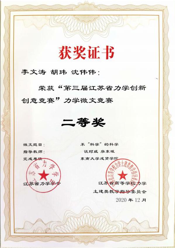 近日,“第三届江苏省力学创新创意竞赛”评审工作落下帷幕。我校土木与交通工程学院廖东斌、谈珂威、陈亮三位老师积极组织,精心备赛,在他们的指导下,徐璇、王欧缘两位同学的作品《力与美的碰撞》获力学文化创意竞赛特等奖(第一名),梁竣皆、蒋浩、秦晓欣三位同学的作品《奇妙的反重力水滴》获力学微文竞赛一等奖,李文涛、胡玮、沈伟伟三位同学的作品《不“科学”的科学》以及张孟睿、禹湘、孙文韬同学的作品《在客船上的跳远问题》获力学微文竞赛二等奖。