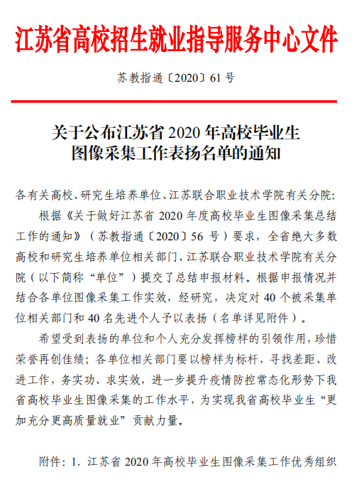 近日,江苏省高校招生就业指导服务中心公布了江苏省2020年高校毕业生图像信息采集工作表扬名单,我校教务处荣获“江苏省2020年高校毕业生图像采集工作优秀组织奖”。
