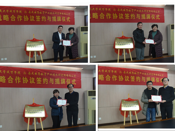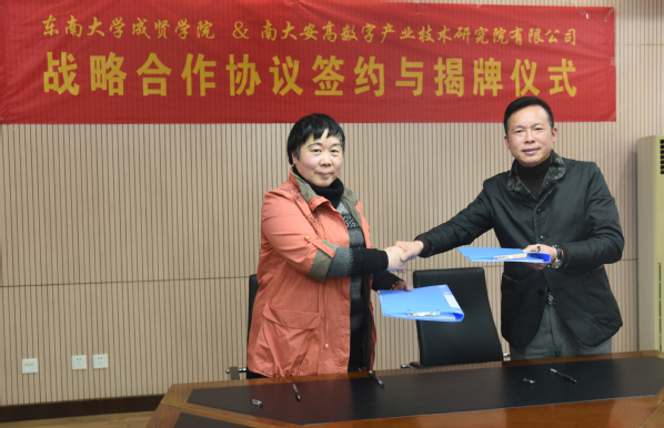 1月13日下午,东南大学成贤学院与南大安高数字产业技术研究院有限公司战略合作协议签约与揭牌仪式在我校真知馆207会议室顺利举行。参加签约及揭牌仪式的嘉宾有南京大学产业党工委委员、南大安高科技集团董事长许志怀先生,南大安高科技集团常务副总裁、数字产业技术研究院院长陆孚生先生、执行院长吴科先生、副院长陆邢先生、培训中心主任李乐女士。成贤学院常务副院长许映秋教授、副院长董梅芳教授、发展合作处处长胡焱教授、教务处副处长陈雪琼,经管学院院长戚啸艳、党总支副书记李清源、副院长孙亮和高凯丽、综合办主任程希羲出席活动。仪式由经管学院院长戚啸艳教授主持。