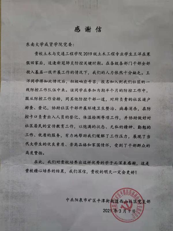 近日,东南大学成贤学院党政办公室收到了来自中共阳泉市矿区平潭街道西山社区党支部发来的感谢信,信中提到我校土木与交通工程学院2019级土木工程2班王洋同学在寒假期间积极响应号召,报名加入社区的一线防控工作队伍,以实际行动彰显当代青年学子的责任与担当。