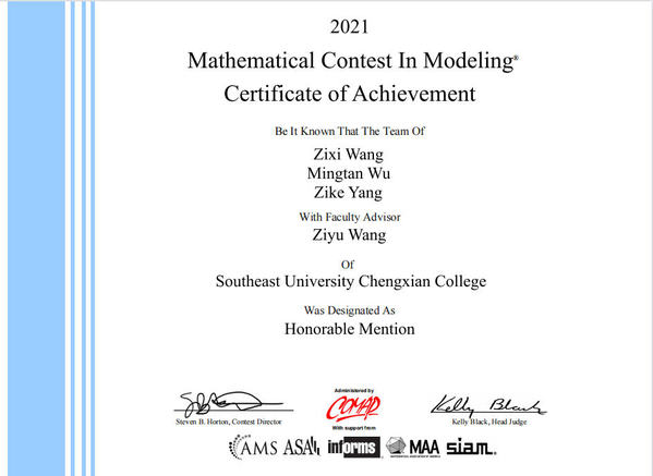 近日,2021年美国大学生数学建模竞赛(MCM/ICM)评审结果正式公布。东南大学成贤学院在本届竞赛中获得了两项国际二等奖(Honorable Mention),打破了以往的获奖记录。