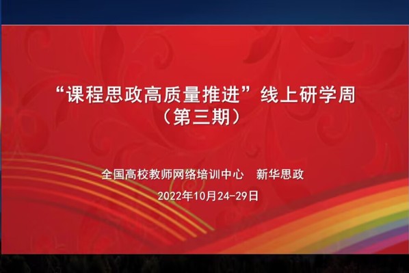 为全面推进我校课程思政高质量建设,打通专业教育和思政教育的“最后一公里”,10月24日-29日,全国高校教师网络培训中心和新华网共同主办了“课程思政高质量推进”研学周(第三期)专题培训。教师发展中心选派我校9名骨干教师参加了此次培训。
