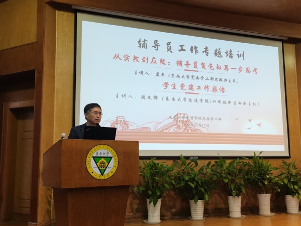 为进一步提升我院辅导员业务能力和工作水平,促进辅导员队伍专业化、职业化建设,11月17日下午,我院在真知馆一楼报告厅举办辅导员工作专题培训,特邀东南大学党委学工部思政办主任孟杰、东南大学四牌楼新生办副主任周文娜担任主讲嘉宾。学院党委副书记、副院长王荣,学生处相关人员,二级学院综合办主任、全体辅导员参加此次培训。培训由学院党委学工部部长施杰主持。