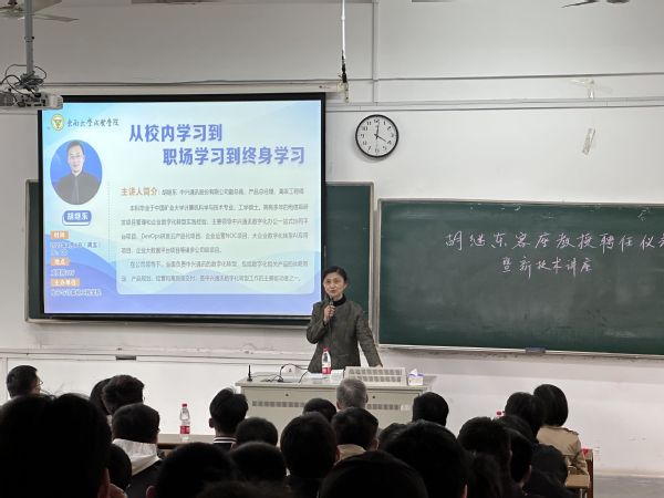 4月7日下午,电子与计算机工程学院邀请中兴通讯股份有限公司副总裁、产品总经理胡继东高级工程师来校作《从校园学习到职场学习到终生成长》主题报告并受聘为我校客座教授。东南大学成贤学院副院长戴玉蓉、电子与计算机工程学院党政领导及100余名师生出席报告会。报告会由电子与计算机工程学院院长王晓蔚主持。
