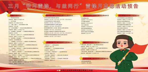 3月5日是第60个全国学雷锋纪念日,也是第24个中国青年志愿者服务日。为学习宣传贯彻党的二十大精神,贯彻落实习近平总书记关于深入开展学雷锋活动的重要指示精神,东南大学成贤学院团委组织开展“学习党的二十大,永远跟党走,奋进新征程”主题教育实践活动,青年志愿者吹响青春集结号,多种形式开展学雷锋志愿服务活动,以实际行动学习践行雷锋精神。