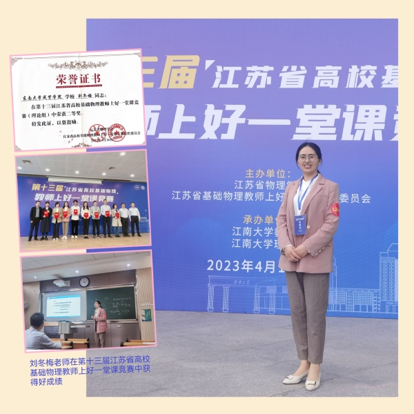 4月14日至16日,第十三届江苏省高校基础物理教师上好一堂课竞赛在江南大学举办。来自东南大学、中国矿业大学、苏州大学、河海大学等全省32所高校组队参赛,共评出一等奖6名,二等奖14名,三等奖20名。我校基础部刘冬梅老师荣获理论组二等奖,我校是全省独立学院中唯一获奖单位。