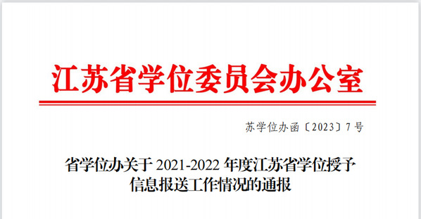 江苏省学位委员会办公室于近日发布了《省学位办关于2021-2022 年度江苏省学位授予信息报送工作情况的通报》(苏学位办函〔2023〕7号),我校获评2021-2022年度江苏省学位授予信息报送工作通报表扬单位,教务处陈雪琼获评2021-2022年度江苏省学位授予信息报送工作通报表扬个人。