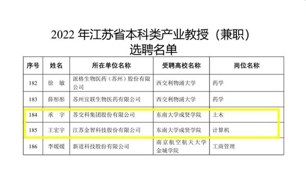 近日,江苏省教育厅、江苏省人才工作领导小组办公室、江苏省科学技术厅、江苏省人力资源和社会保障厅联合下发《关于公布2022年江苏省产业教授(兼职)选聘名单和续聘名单的通知》(苏教研函〔2022〕25号),东南大学成贤学院推荐的苏交科集团股份有限公司承宇、江苏金智科技股份有限公司王宏宇两位企业专家成功获批江苏省2022年产业教授(兼职),实现了我校在该人才项目申报上新的突破。