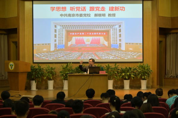 为深入学习贯彻习近平新时代中国特色社会主义思想,全面贯彻落实党的二十大精神和习近平总书记关于“大思政课”和青年工作系列重要论述精神,讲好时代大思政、激发青年大能量。校团委于5月28日晚在真知馆报告厅开展了“学思想、跟党走、建新功”信仰公开课主题讲座,南京市委党校郝继明教授受邀宣讲,近300名五四表彰获奖代表聆听了讲座。