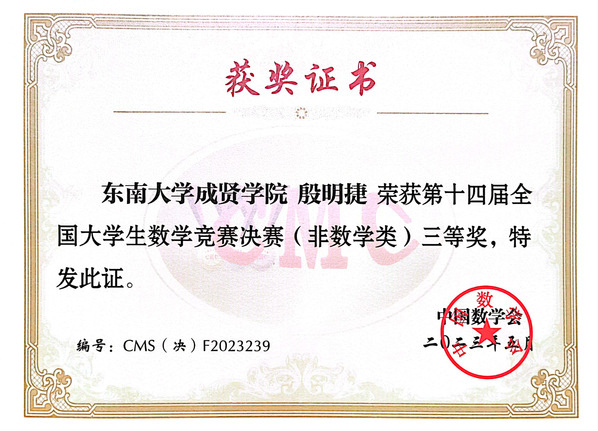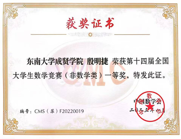 5月27日,由中国数学会主办、广东工业大学承办的第十四届全国大学生数学竞赛决赛在广州成功举行。东南大学成贤学院19级软件工程2班殷明捷同学喜获佳绩。