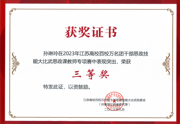 为深入贯彻落实习近平总书记在学习贯彻习近平新时代中国特色社会主义思想主题教育工作会议上的重要讲话精神,紧紧围绕学习宣传贯彻党的二十大精神主题主线,落实习近平总书记关于共青团在高校学生思想政治工作中要发挥主力军作用的重要要求,进一步聚焦思想引领主责主业,团结引领团员青年坚定信念跟党走,勇做走在新时代新征程的奋进者。9月25日,由共青团江苏省委、江苏省委教育工委、新华日报社、江苏省学生联合会联合主办的“学思想、跟党走、建新功”江苏高校百校万名团干部思政技能大比武在宿迁学院顺利举行。我校建筑与艺术设计学院分团委书记江晶荣获“专职团干部专项赛”一等奖,制药与化学工程学院综合办主任刘静荣获“兼挂职团干部和青年教师专项赛”二等奖,土木与交通工程学院辅导员孙琳玲荣获“思政课教师专项赛”三等奖。