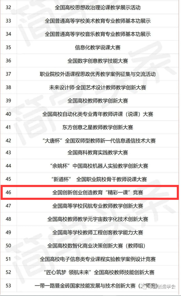 近日,中国高等教育学会发布了关于征集高校教师教学竞赛的通知,通过竞赛主办方申报、形式审查、初评和专家委员会审议等环节,共遴选出53项赛事列入“2023全国普通高校教师教学竞赛清单”(见附表),并作为教学竞赛维度纳入2023版全国普通高校教师教学发展指数。由中国创造学会主办,中国创造学会创新创业创造专业委员会、东南大学成贤学院等高校共同承办的“全国创新创业创造教育‘精彩一课’比赛”位列其中(序号46)。