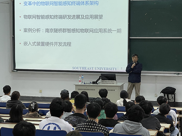 王宏宇教授从变革中的物联网智能感知终端体系架构、物联网智能感知终端研发进展及应用展望和南京隧桥群智感知物联网应用系统一期案例几个方面展开,用通俗易懂的语言,为师生科普了智慧城市应用场景下的物联网智能感知终端平台共性关键技术研究,从物联网终端体系架构、终端芯片与低功耗存算一体技术、开源轻量级操作系统技术以及实际物联网终端应用系统开发与部署等方面,介绍了相关研究和应用的最新进展,研讨了其中的核心关键技术突破。
