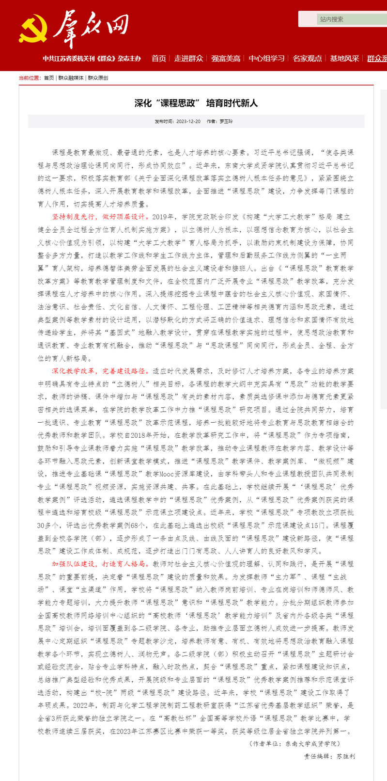 【群众网】深化“课程思政” 培育时代新人