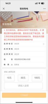 (1)微信端APP:所有用户(含东大研究生)均可通过关注“东南大学成贤学院”公众号并激活绑定手机号在“自助购电”应用中选择“微信”支付方式购电;