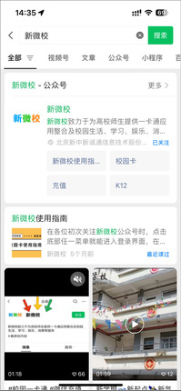 (1)打开微信,在搜索栏中搜索“新微校”,并点击“关注公众号”,如下图所示: