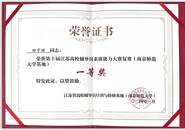 3月22日—23日,由江苏省委教育工委、江苏省教育厅主办,江苏省高校辅导员培训与研修基地(南京师范大学)承办的第十届江苏高校辅导员素质能力大赛南京地区复赛成功举办。来自宁、镇、扬三个地区的40所本科院校辅导员同台竞技,经过激烈角逐,我校土木与交通工程学院辅导员田宇婷以优异成绩斩获一等奖,成功晋级省赛决赛,实现我校在该项赛事中的新突破和历史最好成绩。