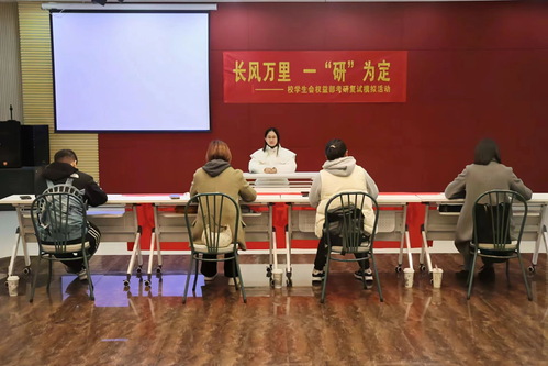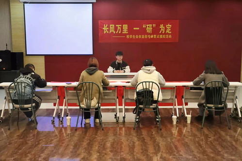 为助力我校学子顺利通过考研复试,在模拟场景中体验复试流程,通过接受专业指导和评价,了解自身不足,3月27日下午,由校团委、学校就业办、校学生会举办的“我为同学做实事”——“长风万里,一研为定”模拟考研复试活动在综合楼多功能厅307举行,活动得到文登考研的大力支持。