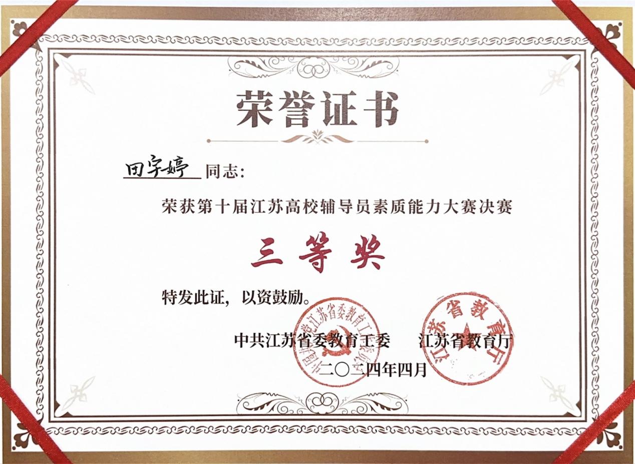 田宇婷老师(右三)荣获第十届江苏高校辅导员素质能力大赛决赛三等奖