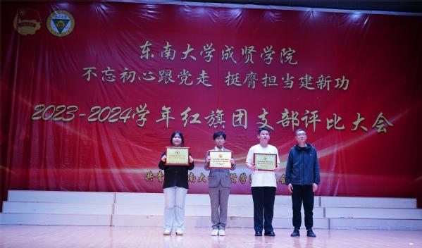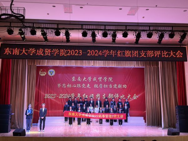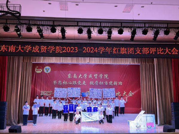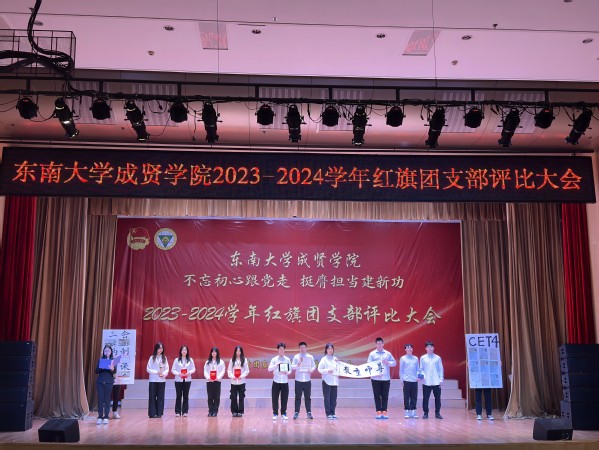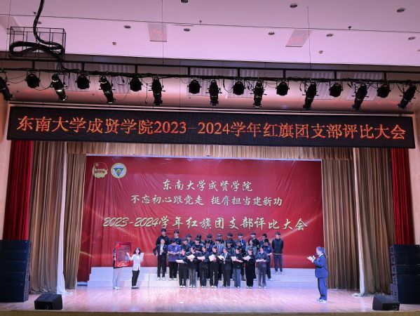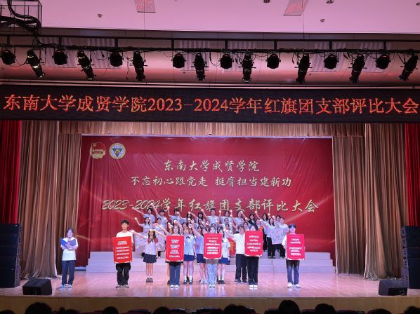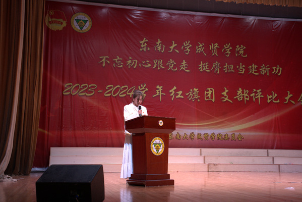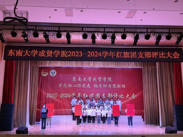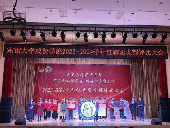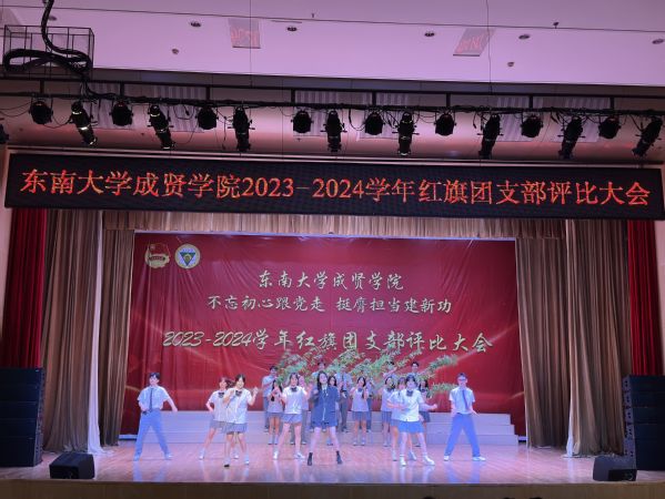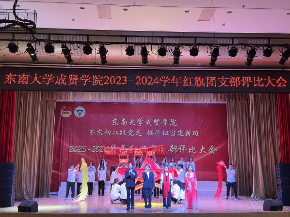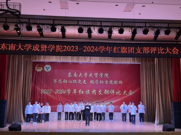 为集中展示我校基层团支部活力,更好凝聚青年力量,4月28日晚,由共青团东南大学成贤学院委员会主办的“不忘初心跟党走,挺膺担当建新功”2023-2024学年红旗团支部评比大会在综合楼报告厅举行。评审团由专家评委和大众评委组成,学校教务处副处长陈雪琼,后勤管理处副处长丁秀山,党政办公室主任助理谢静娴,学生处处长助理颜秉明、沈黎芳担任专家评委,各学院学生骨干组成大众评委。校团委书记、人武部部长潘明烽,部分综合办主任、分团委书记、辅导员,参评支部成员、大一大二团支委600余人参加了大会。