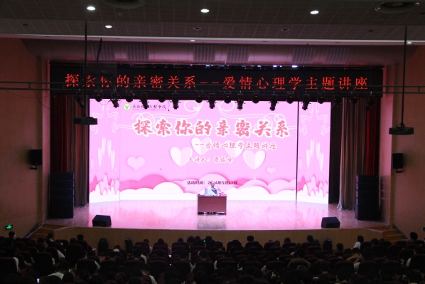 5月17日晚由学生处、校团委主办,校学生会外联部承办的“探索你的亲密关系”为主题的爱情心理学主题讲座在我校综合报告厅举行,此次主题讲座为同学们树立正确的恋爱观和择偶观打下了良好的基础,增强了他们面对情感问题的承压能力和处理技巧,有效促进了学生全面发展。