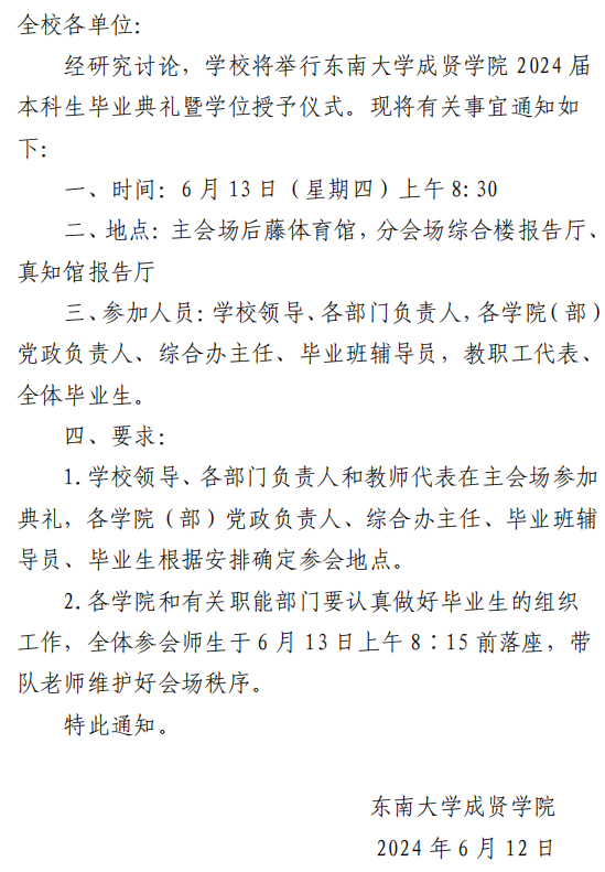 关于举行东南大学成贤学院2024届本科生毕业典礼暨学位授予仪式的通知