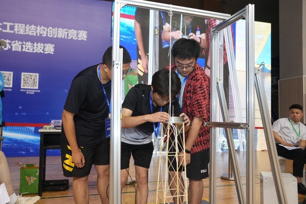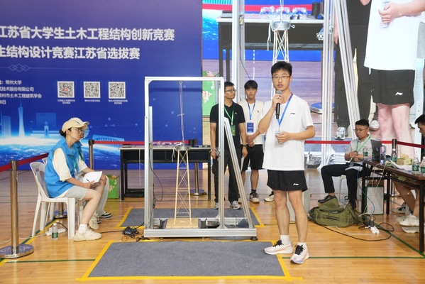 本次大赛由江苏省土木建筑学会主办,常州大学承办,共有来自东南大学、河海大学、南京航空航天大学等30余所省内高校、54支参赛队、300余名土木工程专业本科学生参加。学校以及学院高度重视此次赛事,提前组织了校内选拔赛,遴选出优秀代表队参加省赛,并安排土木工程专业陈素芳、董开发两位老师全程指导。本次竞赛以“考虑水平振动的高耸塔式结构”为主题,通过在赛题中加入部分待定参数,赋予赛题更多灵活性。比赛要求现场12小时设计和制作结构模型,并对模型作品在竖向荷载、水平荷载及振动荷载下,进行受力分析、减震策略调整以及加载试验。作为大学生科技创新的重要赛事,土木工程结构设计创新竞赛着重考验学生的计算分析、设计、试验等综合能力。