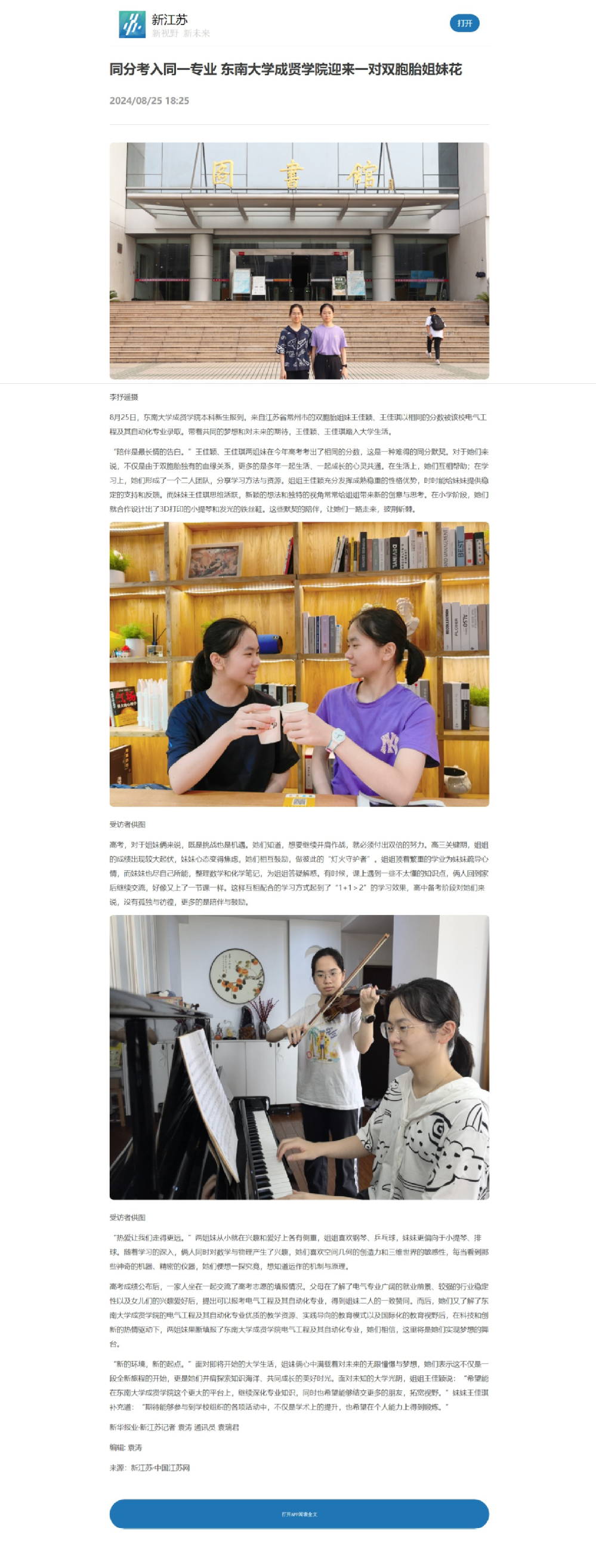 【新江苏】同分考入同一专业 东南大学成贤学院迎来一对双胞胎姐妹花