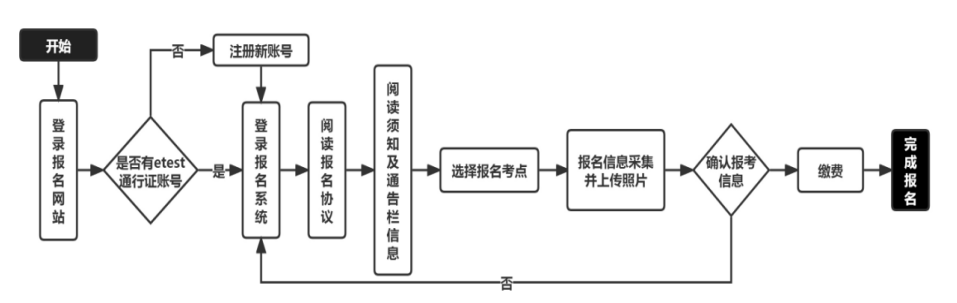 3. 网上报名需使用ETEST通行证账号登录,该账号在教育部教育考试院所有使用ETEST通行证的报名系统中通用。若考生已有ETEST通行证,则直接登录报名;若没有该账号,需要先进行账号注册后再进行报名。请使用本人真实有效的邮箱和手机号进行注册,以便必要时重置或找回密码。