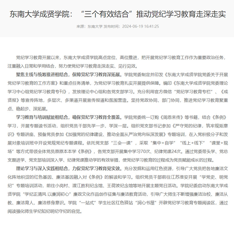 【全国高校思想政治工作网】东南大学成贤学院:“三个有效结合”推动党纪学习教育走深走实