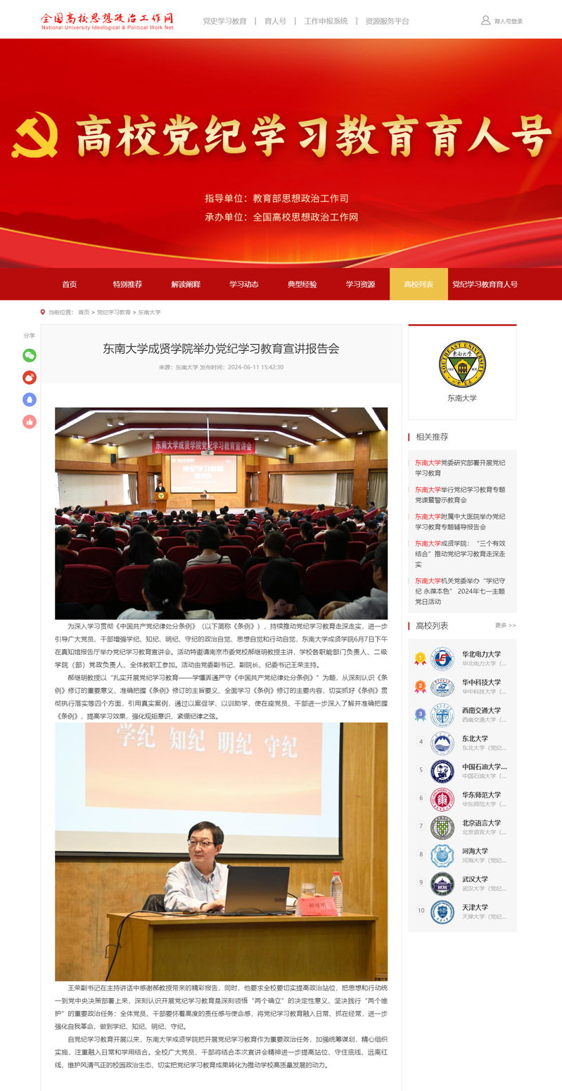 【全国高校思想政治工作网】东南大学成贤学院举办党纪学习教育宣讲报告会