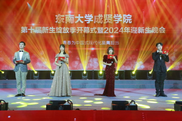 10月21日、22日晚,东南大学成贤学院第十届新生绽放季开幕式暨2024年迎新生晚会在学校后藤体育馆隆重举行。学校党委书记张志胜,常务副院长黄学良,党委副书记、副院长、纪委书记王荣,副院长戴玉蓉、魏丽玲,相关职能部门负责人,二级学院党总支书记、院长、副书记、综合办主任、分团委书记、其他老师,以及泰山新村派出所副所长李庆伟,志愿服务共建单位路西社区党委书记孙良,活动赞助商文登考研华东区教学总监、南京校区总校校长张伟,本土潮牌TIMEBIKE主理人尹鑫鑫和龙湖南京江北天街总经理肖锐应邀参加活动,与2024级新生们共度本场晚会。