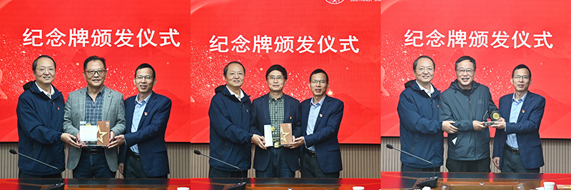 伴随着激昂的音乐和热烈的掌声,纪念牌颁发仪式正式开始。党委书记张志胜、常务副院长黄学良共同为三位同志颁发纪念牌。