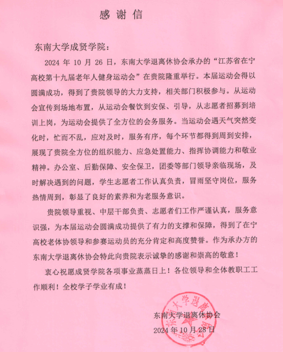 东南大学退离休协会致成贤学院感谢信