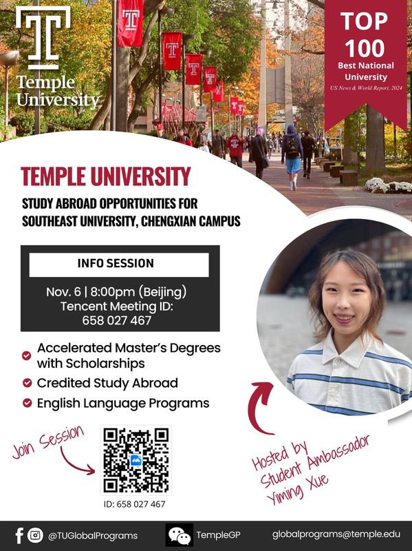 美国天普大学是与我校签署合作交流协议的大学之一。为了更全面了解该大学专业设置、项目优势、申请硕士条件及校园生活等内容,美国天普大学拟将为我校学生举办“东南大学成贤学院线上宣讲会”,具体安排如下: