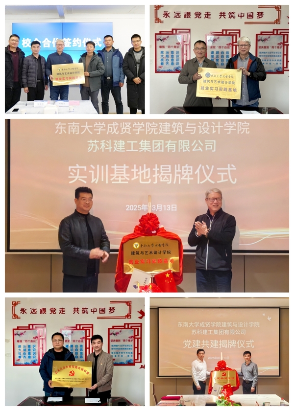 苏科建工集团有限公司是一家致力于房屋建筑、市政路桥、房地产开发销售、钢结构制造和物业管理的一体化公司。建艺院一行走访了苏科建工集团运管中心,并详细了解了集团的发展历程以及近年来集团党团工作取得的成果。校企双方针对人才培养、技术创新、资源优化等多个维度进行了深入的沟通与洽谈并达成了多项共识,同时签订了党建共建联盟协议书、挂牌“党建共建单位”,并签订了校企合作协议书、挂牌“东南大学成贤学院建筑与艺术设计学院就业实习实践基地”。未来,双方将通过共建学习基地、实践基地,在教学实践、就业探讨、服务社会等多方面建立长期、紧密的合作共建关系。