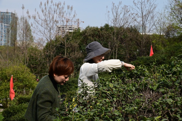 活动伊始,后勤管理处副处长丁秀山从学校茶树的品种、历史等方面给大家做了详细地介绍,并讲解了采茶标准与安全事项,强调“一芽一叶”的采摘要领。教职工们在翠绿茶垄间俯身采摘,形成一道生机盎然的风景线。