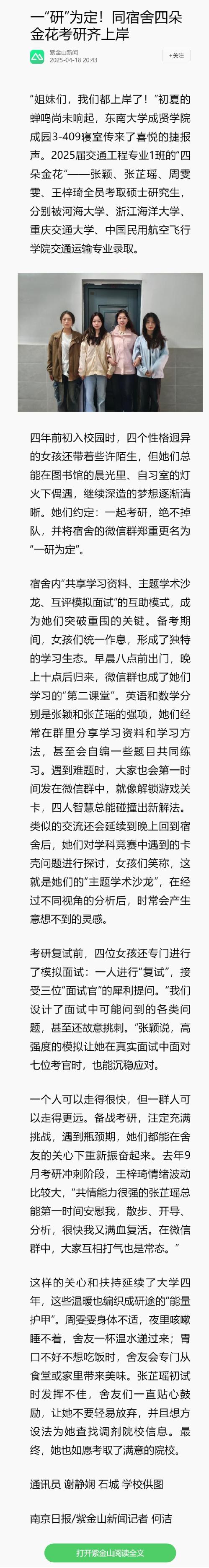 【南京日报 紫金山新闻】一“研”为定!同宿舍四朵金花考研齐上岸