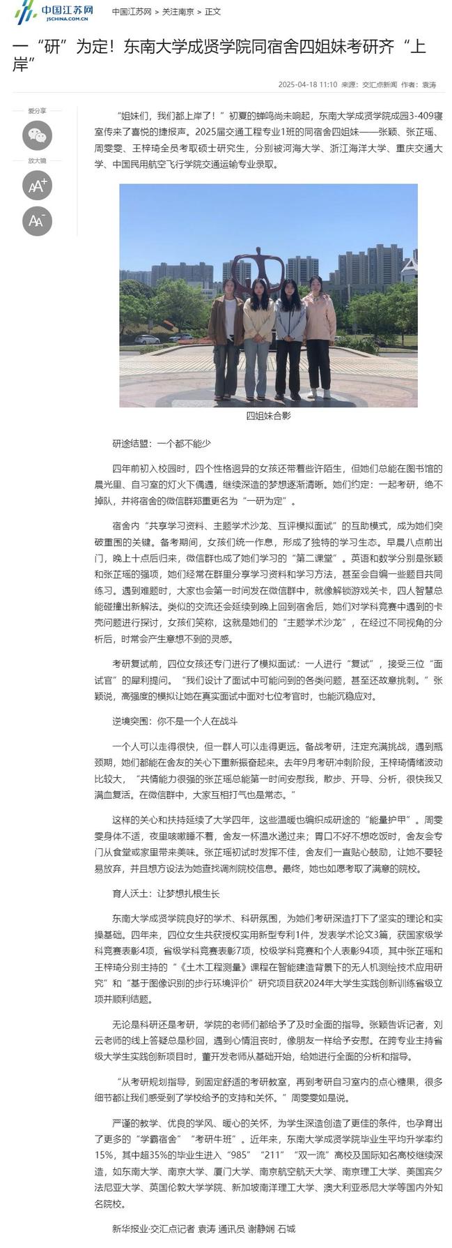 【中国江苏网】一“研”为定!东南大学成贤学院同宿舍四姐妹考研齐“上岸”