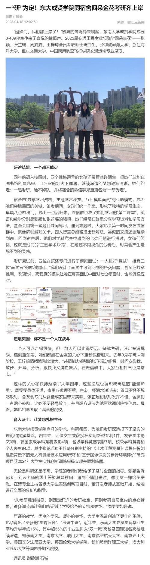 【交汇点新闻】一“研”为定!东大成贤学院同宿舍四朵金花考研齐上岸