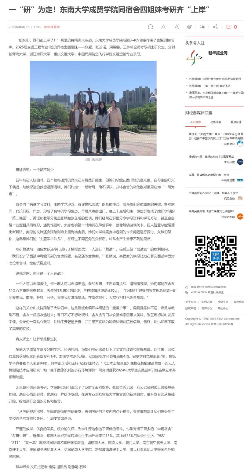 【新华报业网】一“研”为定!东南大学成贤学院同宿舍四姐妹考研齐“上岸”