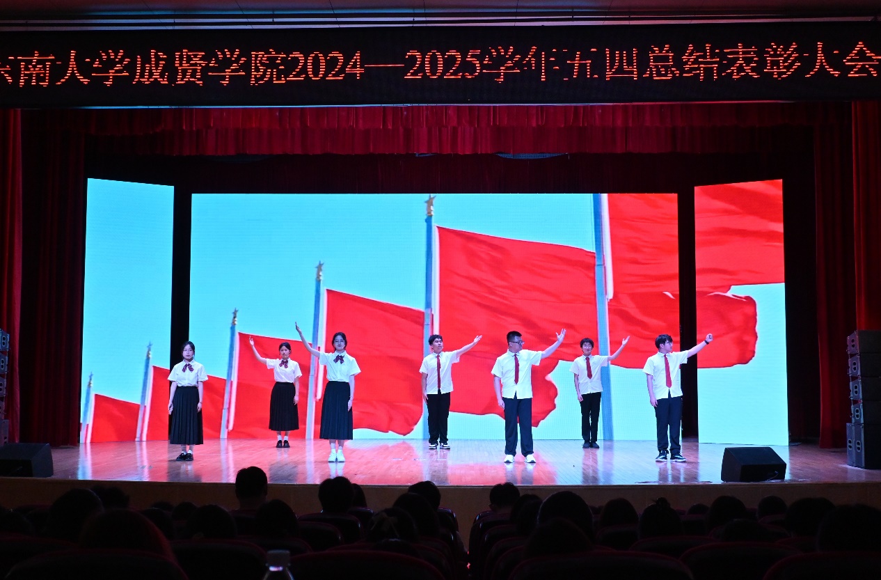 开场舞《以少年之名》和视频《青年青春奋斗》以鲜活的镜头勾勒出成贤学子的昂扬姿态。大会在师生齐唱《中国共产主义青年团团歌》的澎湃旋律中拉开帷幕。戴玉蓉副院长向全校一万多名青年师生致以节日的问候,向受到表彰的先进集体和个人表示热烈的祝贺,她希望成贤青年,一是要坚定理想信念,筑牢信仰之基;二是要勤奋学习知识,练就过硬本领;三是要积极投身实践,践行社会责任,并鼓励全体青年学子以五四精神为指引,坚定理想信念,勇担发展重任,成才不负青云志,报国常怀赤子心。