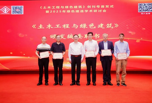 5月25日,由江苏省土木建筑学会主办、《土木工程与绿色建筑》编辑部承办的《土木工程与绿色建筑》创刊号首发式暨2025年绿色建造学术研讨会在南京召开。江苏省土木建筑学会理事长缪昌文院士,江苏省科协秘书长范银宏,东南大学教授刘加平院士,省学会副理事长路宏伟、刘永刚、陆伟东、张雁、蒋振雄、王华,秘书长卢红标等来自全国高校、科研院所、行业企业及管理部门的专家学者200余人齐聚一堂,见证期刊更名改版的历史时刻,共话土木建筑绿色转型的时代命题。我校土木与交通工程学院院长郭正兴教授应邀参会并获聘该杂志编委。