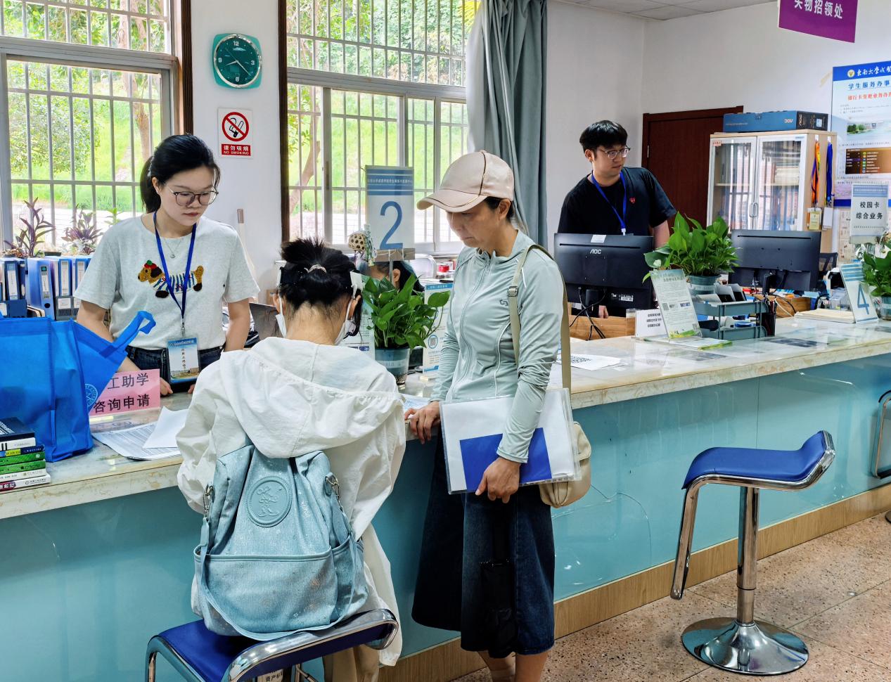 为保障迎新工作高效有序开展,学校高度重视、周密部署,各部门分工合作,热情服务。面对高温与降雨天气,学校坚持以生为本,未雨绸缪,对迎新全流程服务进行了周密优化与升级。学校在各点位备足防暑物资、设置休息区;在南京南站、南京火车站的接站处做好周到的指引服务;各二级学院报到点布置一新,辅导员老师、志愿者热情为新生办理入学手续,耐心答疑解惑;经学校相关部门积极联系,南京市公安局内保支队、江北新区公安分局内保支队、泰山新村派出所、江北新区交通警察支队第一大队在校区及周边进行交通疏导、维持秩序,并对新生进行安全知识宣传。热情的迎新氛围和“一站式”的贴心服务让踏进校门的新同学们第一时间感受到“家”的归属感。