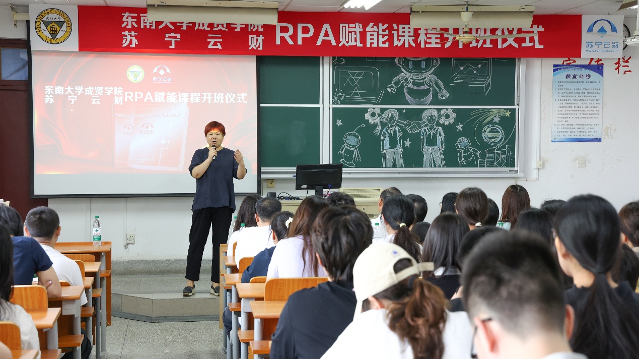 9月10日上午,经济管理学院与苏宁云财RPA赋能课程开班仪式在华馆302教室举行,苏宁云财总经理陈礼,副总经理曹红、钟方玲等一行11人,经济管理学院院长戚啸艳、副院长高凯丽等,学生代表69人参加了此次开班仪式。