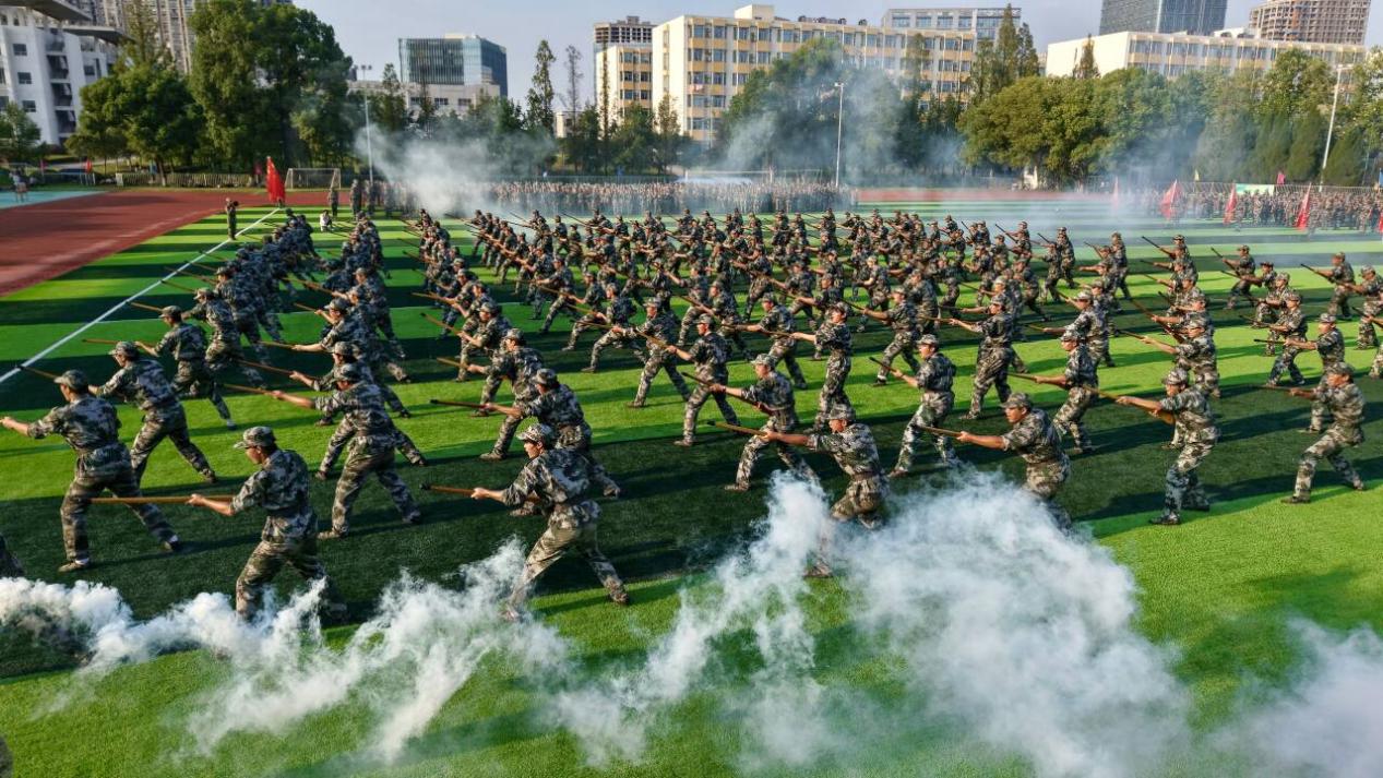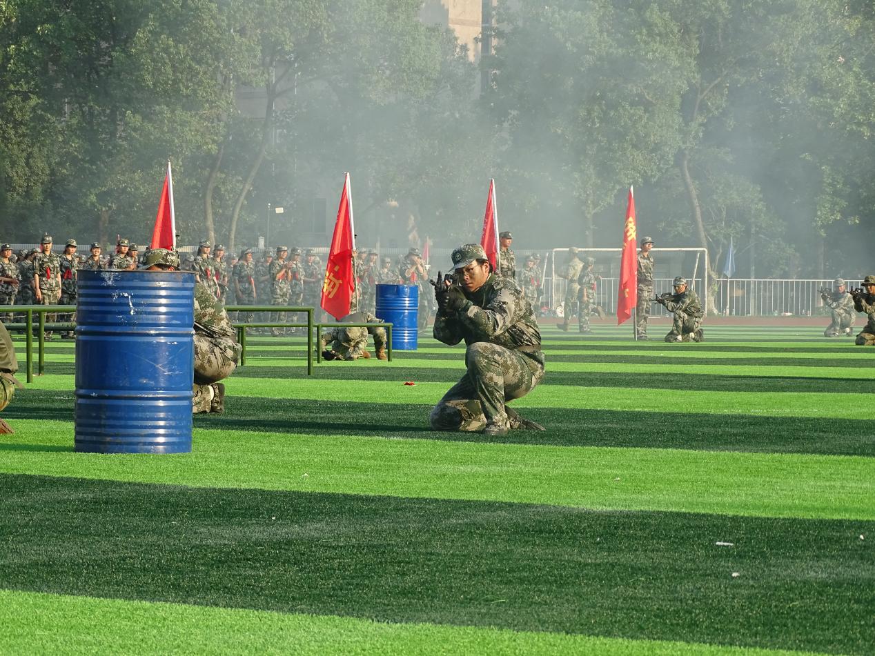 在庄严的国歌声中,大会正式拉开帷幕。随后,2025级参训学生进行了气势恢宏的军事训练成果汇演。各方队依次进行了分列式、军体拳、匕首操、刺杀操和战术演示等多项军事科目展示。同学们步伐铿锵、动作整齐、口号响亮,战术动作逼真连贯,充分展现出连日严格训练的优异成果和成贤学子昂扬向上的精神风貌,赢得了全场阵阵掌声。
