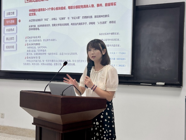 曹清华老师首先针对“思政技能大比武”赛事进行了系统梳理与剖析。她指出,讲稿撰写应立足小切口阐述大叙事,逻辑清晰、案例典型、兼顾本土特色与表达技巧;视频录制需在有限时间内精准传达内容,做到形式服务内容;现场展示应注重前期积累与演绎技巧,以优秀案例解析如何优化表现。就“微课教学比赛”,曹老师强调微课需目标明确、契合课标与人才培养要求;学情分析应基于实际,借助访谈、数据与AI技术等方式深入了解学生;教学方法可综合运用情境导入、案例教学、问题探究及多种技术形式,增强互动与启发性,实现短时高效教学。
