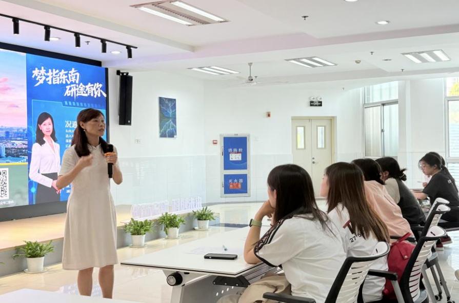 在讲座中,况迎辉教授带领在场师生回顾了东南大学百余年的辉煌发展历程,生动描绘了学校大师云集、底蕴深厚的历史画卷,阐释了严谨求实、追求卓越的学术传统,系统梳理了东南大学的研究生招生政策与培养特色,更紧密结合我校学生的学业背景与发展阶段,提供了极具实操性的报考建议。她从考研关键时间节点、报名注意事项,到专项计划解读与复习策略,均作了细致讲解,帮助同学们打破信息壁垒,减少备考盲点。