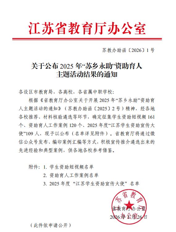 1月27日,江苏省教育厅公布2025年“苏乡永助”资助育人主题活动评选结果,我校报送的学生资助短视频《助学逐梦 向光而行》《我贤有所为 助人也育人》获评优秀作品;经济管理学院2023级学生岳明君获评2025年度“江苏学生资助宣传大使”。